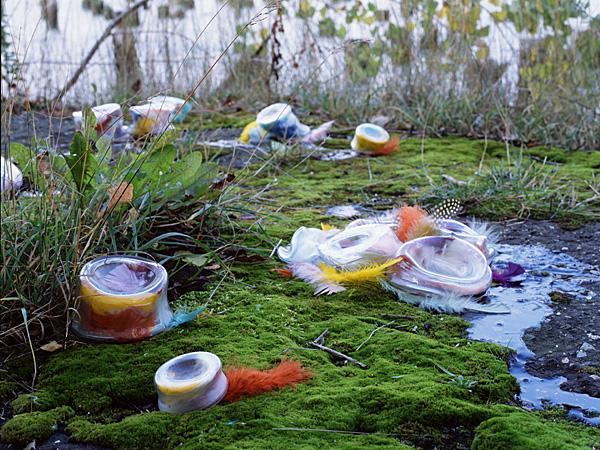 | Moor I, digital c-print mounted on aluminum, 30 x 40" edition of 5 installed November 2, 2003, North side of Pier 57, 15th Street & 11th Avenue, New York City, glass bottles, feathers, corn syrup © 2003 Bethany Bristow |